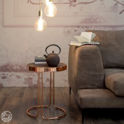 Sa structure métallique est disponible en finition chrome noir ou chrome cuivré ; le plateau rond de 40 cm de diamètre est en MDF recouvert de bois, disponible en noyer canaletto, frêne noir ou chêne foncé traité thermiquement.