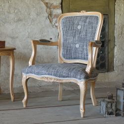 Classique et élégant, enrichi d'incrustations raffinées et de deux boutons au dos, ce fauteuil meuble le salon avec style.