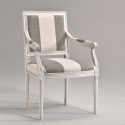 Les accoudoirs, décorés et partiellement recouverts, complètent le design du fauteuil classique.
