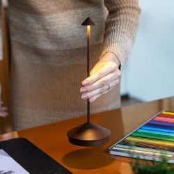 Pina è una lampada ricaricabile, funziona senza fili e si può usare sia in ambienti interni sia all'esterno. L'intensità della luce si può regolare a piacere con il pulsante touch sulla base.