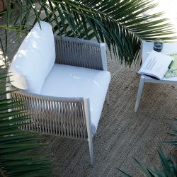 Questa poltrona da esterno è perfetta per arredare giardini e terrazze. La struttura lineare in tubolare di alluminio color grafite, si sposa perfettamente con il rivestimento in corda in poliolefina ecologica intrecciata a mano.