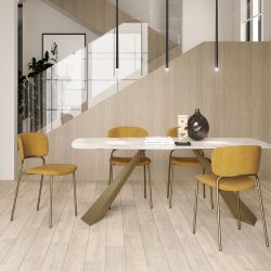 La sedia Sunrise A presenta una struttura in metallo verniciato, disponibile in più varianti, mentre la seduta è imbottita e rivestita con vari tipi di tappezzeria: tessuto o similpelle.