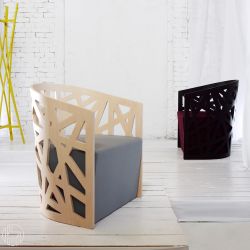 Mazy è progettata attorno allo schienale in multistrato, curvato e alleggerito da un traforo che disegna un labirinto di rami intrecciati. La seduta racchiusa all'interno ha una struttura in legno imbottita con poliuretano espanso e rivestita in tessuto.