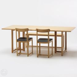 Nel progettare questo tavolo rettangolare il designer trova fonte di ispirazione nella British Utility Furniture degli anni ’40. La struttura a quattro gambe è realizzata in legno di rovere, proposto in finitura naturale o laccato nero.
