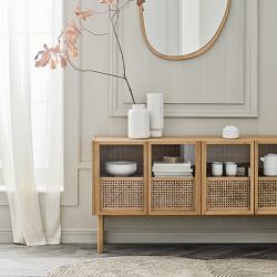 La collezione Cana di Bolia si caratterizza per il design minimale e la parte frontale degli arredi in paglia di Vienna, che dà a questa linea un aspetto leggero. La serie comprende comodini, madie e mobili contenitori per la zona giorno e la zona notte, pensati per arredare la casa creando un'atmosfera tranquilla.