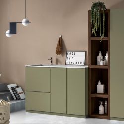 La collezione Idrobox è un sistema completo di mobili per lavanderia che include elementi contenitori, a giorno e accessori, pensato per soddisfare ogni esigenza di arredamento e organizzazione dello spazio.