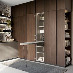 Questa soluzione è composta da elementi a colonna e un modulo attrezzato con asse da stiro a scomparsa dotato di copriasse e tre mensole interne. L'anta ha l'apertura a battente a 270°.