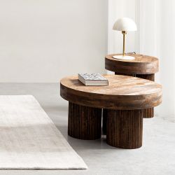 Realizzato in legno di mango massello tinto naturale è caratterizzato da un piano tondo e da un basamento centrale con tre gambe effetto cannettato.