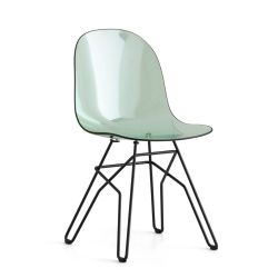 La struttura è realizzata in metallo verniciato con finitura opaca, mentre la seduta è in policarbonato trasparente, disponibile in diversi colori.