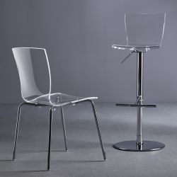 Sedia di design, con struttura a quattro gambe in tubo d'acciaio cromato e seduta monoscocca in metacrilato completamente trasparente.