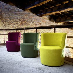 Il suo volume cilindrico si allarga leggermente verso l'alto. Lo schienale è inglobato nella circonferenza della seduta, come se fossero un pezzo unico. Solo un segno al lato della poltrona evidenzia l'elemento verticale dello schienale.