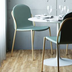 La struttura a 4 gambe in metallo verniciato, satinato o cromato abbraccia delicatamente la scocca imbottita. Disponibile in un'ampia scelta di rivestimenti e colori: