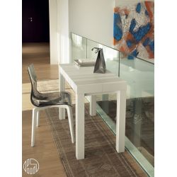 Consolle con struttura in mdf laccato bianco opaco o tortora opaco, semipiani e allunghe in melaminico rispettivamente bianco opaco a poro aperto frassinato o melaminico corda opaco.