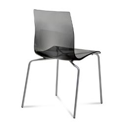 Sedia con struttura in metallo verniciato, satinato oppure cromato; la scocca è in SAN trasparente nei colori: rosso, azzurro, fumè oppure interamente trasparente.