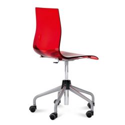 Sedia girevole, con struttura in metallo verniciato o satinato; la scocca è in SAN, disponibile nei colori rosso trasparente, azzurro trasparente, fumè trasparente, trasparente.