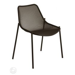 Round è interamente in acciaio verniciato con seduta e schienale in maglia metallica di lamiera stirata.