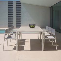 Interamente realizzato in alluminio verniciato, il tavolo Terramare presenta piano rettangolare 203 x 103 cm. L'altezza del tavolo da giardino è di 74 cm.