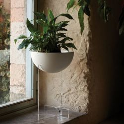 La fioriera Made in Italy è realizzata in polietilene stampato in rotazionale, con riserva d'acqua e struttura in metacrilato (spessore 10 mm) trasparente che la rende come sospesa.