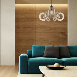 Ricciolo è una lampada a sospensione con il paralume in metacrilato ed i particolari cromati. Il design di questa lampada, reso unico dai riccioli che formano il paralume, ricorda quello dei lampadari classici in vetro soffiato.