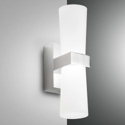 Lampada da parete con struttura in metallo cromo e metacrilato a forma di cilindro.