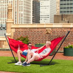 Questa amaca di lusso non ha bisogno di alberi o corda; è sostenuta da un robusto telaio in metallo, con piedini in gomma.
