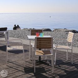 La struttura è in alluminio verniciato bianco o nero, mentre seduta e schienale sono realizzati in doghe di eco-teak.