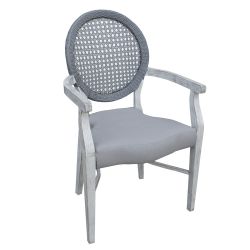 Questa sedia presenta una struttura in alluninio verniciato con effetto consumato, unìo schienale in polietilene intrecciato, e una seduta imbottita e rivestita in tessuto idrorepellente.