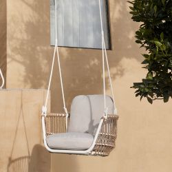 Il modello, da appendere, presenta una struttura in alluminio e un rivestimento in corda sintetica Wintech. Braccioli e schienale, uniti in un unico elemento dalle linee arrotondate, assicurano comodità e creano un'atmosfera accogliente. Due soffici cuscini, sfoderabili, donano ulteriore morbidezza.