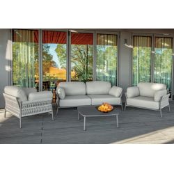 Il divano e le poltrone del Set Easy Idol Collection è realizzato con struttura in color grigio antracite, corda in color grigio chiaro e cuscineria in tinta. Il tavolino, con piano quadrato in alluminio, è in tinta con la struttura degli imbottiti.