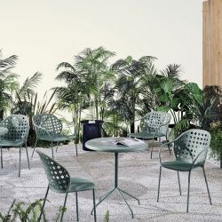 La serie comprende diversi modelli realizzati con base in acciaio inox e piano in lamiera forata zincata, disponibile in più colori. Funzionale ed elegante, Brise è perfetto per creare uno spazio esterno all'insegna del relax e della convivialità.
