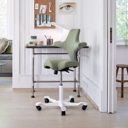 La seduta a forma di sella favorisce il movimento e il cambio di posizione per una seduta sempre attiva, e lo schienale sono imbottiti. Grazie al BalancedMovementMechanism, il margine anteriore del sedile si inclina verso l'alto quando ci si piega indietro e in basso quando ci si piega in avanti. Questo stimola il movimento delle caviglie ed attiva meccanismi di pompaggio venoso nella parte inferiore delle gambe aumentando la circolazione sanguigna in tutto il corpo. La sedia ergonomica si può usare anche al contrario per avere una posizione di sostegno per il torace.