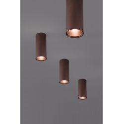 Lampada a soffitto in metallo; una luce che punta dritto all'obiettivo, con una linea semplice e minimalista. Un tubo in metallo verniciato che scende dal soffitto, perfetto per rendere scenografico ogni ambiente della casa.