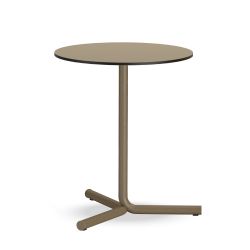 Il tavolo è disponibile con piano in laminato o HPL (bordo con anima nera), rotondo o quadrato. Su richiesta, alla base in metallo è possibile abbinare anche un piano in Fenix o in fibra di vetro riciclata.