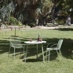 La collezione Hiray ha un design essenziale, dal gusto vagamente retrò. Tavolo e sedute sono accomunate da una struttura leggera costituita da fili in metallo.