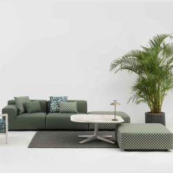 Il divano Plastics di Piero Lissoni si presenta con una nuova veste, grazie all'utilizzo dei tessuti Liberty appositamente progettati per gli spazi all'aperto.