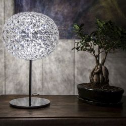 Elegante come un cristallo luminoso, multisfaccettato e brillante questa lampada di design arreda con stile ogni ambiente. Il diffusore a forma di una sfera leggermente schiacciata ai poli, di diametro 33 cm ed è realizzato in tecnopolimero trasparente o colorato in massa, mentre la struttura è in alluminio pressofuso lucidato.