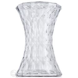 Realizzato in policarbonato trasparente, un materiale resistente agli agenti atmosferici, lo sgabello made in Italy è presentato in diversi colori: fumè, rosso, giallo, ambra, totalmente trasparente o in versione oro o cromata.