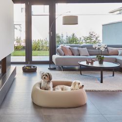 Questa cuccia per cani si ispira alle forme ampie dei moderni mobili di design ed è studiata per armonizzarsi bene con essi. La particolarità di questa cuccia risiede nei bordi in schiuma di poliuretano, studiati per sorreggere il muso dei nostri amici a quattro zampe e mantenere la forma inalterata nel tempo. Il cuscino interno della cuccia è in poliuretano ed è removibile. Tutti i materiali usati per le imbottiture della cuccia sono lavabili ipoallergenici. Il rivestimento della cuccia è in poliestere Trevira CS, sfoderabile e lavabile a 60°C.