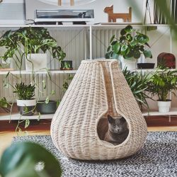 Questa cuccia per gatti è il rifugio ideale per i loro momenti di riposo. Progettata con un design moderno e facile da integrare nell'arredamento di casa, la cuccia Perla è realizzata in rattan naturale o corda intrecciata color antracite. La forma avvolgente dà un senso di sicurezza al gatto, che al suo interno si sente protetto e al tempo stesso ha sempre una visione completa sull'ambiente circostante. Resistente anche a raggi UV e ai batteri, questa cuccia si può usare anche all'esterno.