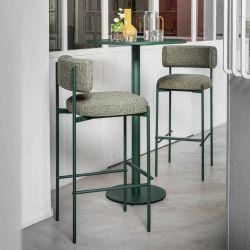 Realizzato con base a quattro gambe in metallo e sedile e schienale imbottiti, rivestiti in pelle, similpelle o tessuto. È possibile personalizzare lo sgabello con tessuti o colori differenti tra sedile e schienale, oppure scegliere un tessuto o colore a contrasto per l'inserto frontale dello schienale, permettendo un alto grado di personalizzazione per adattarsi a diversi ambienti e stili. Contattare il servizio clienti per maggiori informazioni.