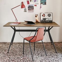 La struttura è in metallo verniciato, mentre il piano rettangolare è realizzato in legno impiallacciato