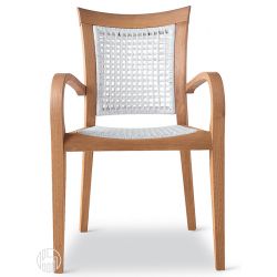 Dall'innovativa combinazione tra legno e textilene nasce questa sedia da giardino con braccioli.