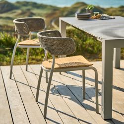 La collezione 101 di Mindo arreda la sala da pranzo esterna di casa con uno stile caldo ed elegante. La linea include sedie per giardino, tavoli di varie misure e una seduta lounge in coordinato con la sedia.