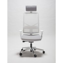 Sedia direzionale per ufficio, caratterizzata dalla struttura in nylon bianco, particolarmente moderno e luminoso. Lo schienale è attrezzato con supporto lombare regolabile ed è in rete traspirante di colore bianco, in tinta con la struttura.