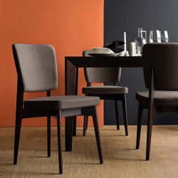 Comfort e design caratterizzano questa sedia in legno di faggio con seduta e schienale imbottiti e rivestiti in tessuto.