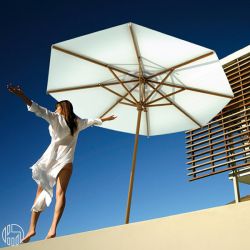 L'ombrellone è dotato di camino anti vento e sistema di apertura manuale con doppia carrucola.