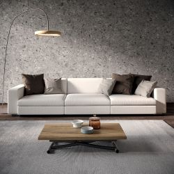 Trasformabile in un tavolo da pranzo per 8 persone, Sydney è la soluzione perfetta per ambienti moderni con poco spazio. La struttura del tavolino è in metallo verniciato, mentre il piano è in ecolegno, disponibile in varie finiture. La base è dotata di ruote e di meccanismo con alzata a gas per alzare il piano. L'altezza si può regolare a piacere.