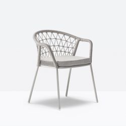 La struttura della poltroncina è in acciaio verniciato, disponibile in vari colori, rivestito da corda sintetica intrecciata con motivo geometrico, in tinta con il telaio. La seduta a doghe di metallo resa confortevole dal cuscino imbottito.