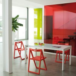 - piano in vetro bianco o nero, abbinato a struttura verniciata in tinta o in alluminio anodizzato; allunga in MDF laccato argento