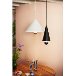 Lampada dal design minimalista. Il paralume è un cono metallico alla cui base in plexiglass è attaccata una brillante sfera.
